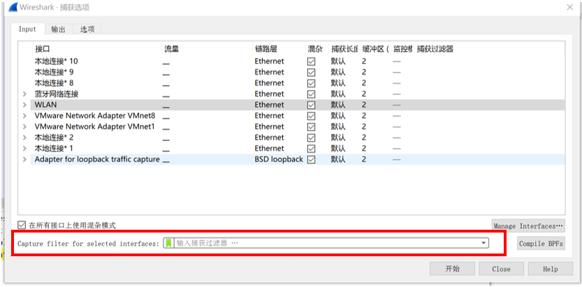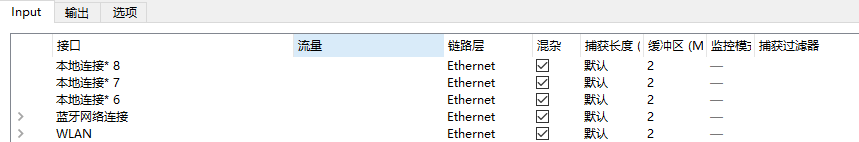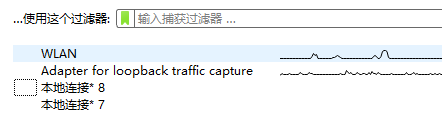 打开 WireShark 后,界面会出现监测到的系统端口,选择其中一个端口就可以监测该端口的数据包流量。