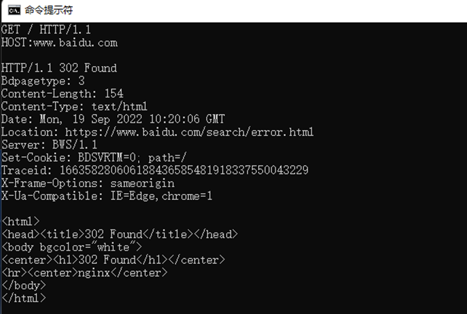 telnet连接后,注意第二句命令GET / HTTP/1.1中/附近的空格,第一个有空格第二个没有。 - 在执行