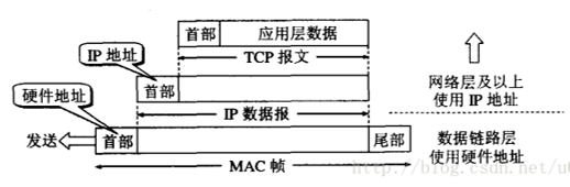 IP地址是网络层和以上各层使用的地址,是一种逻辑地址(IP地址使用软件实现的),而MAC地址是数据链路层和物理层使用的地址,是与网卡硬件绑定的地址,在出厂时由制造商写入,因此被称为物理地址或硬件地址。如下图所示,在源主机发送数据时,数据从高层到低层依次封装,然后才到通信链路上传输。比如,网络层中使用IP地址的数据报一旦交给了数据链路层,就被封装成了MAC帧。