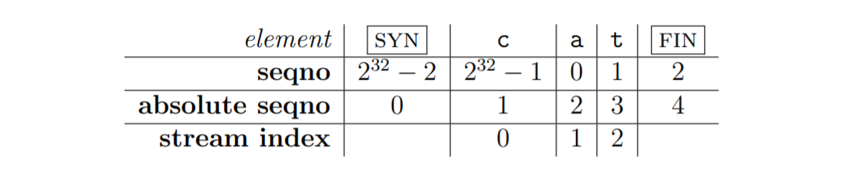 - 绝对序列号 absolute seqno:从 0 起步,包含 SYN 和 FIN,64 位非循环计数 [TCP]